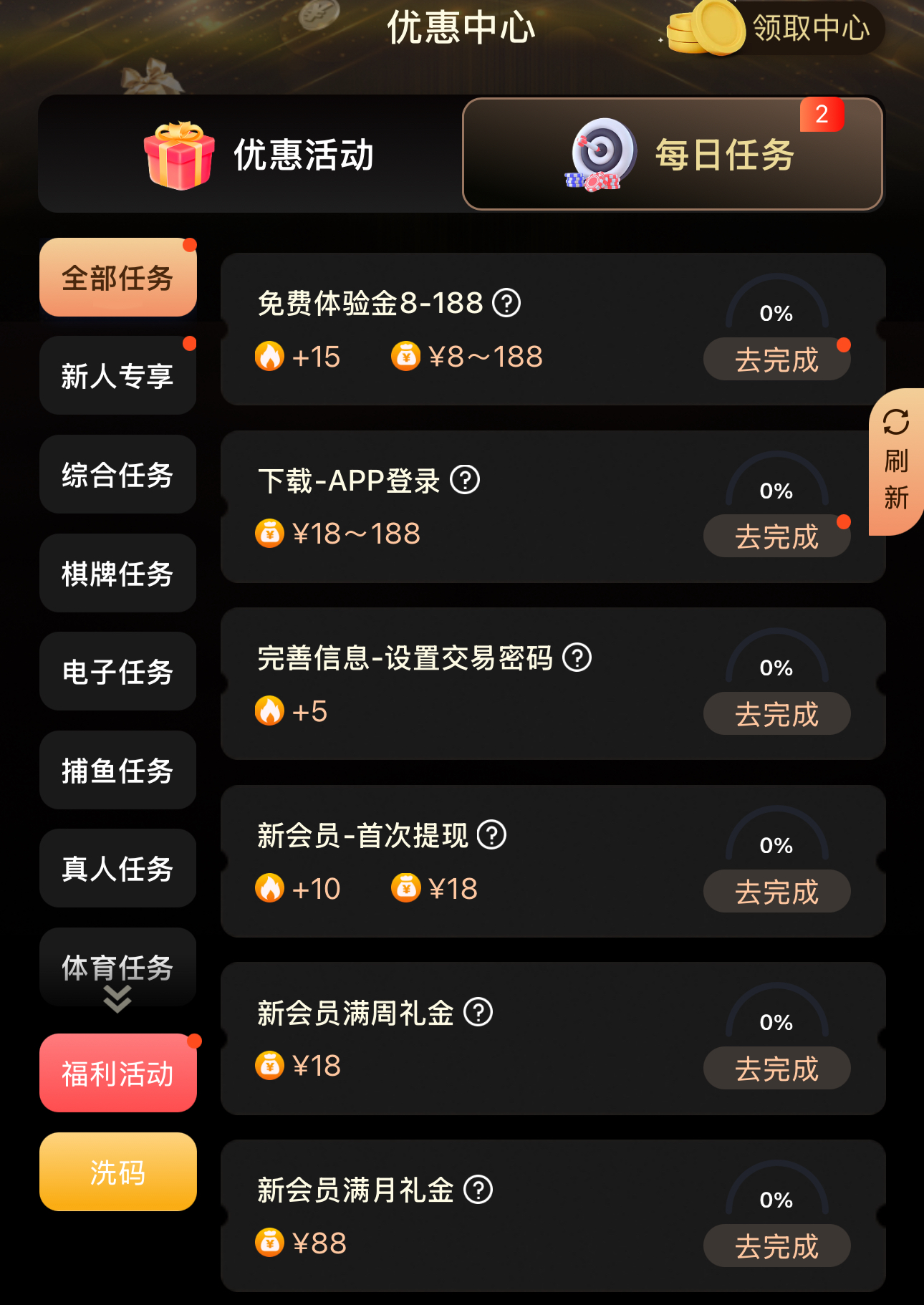 新用户注册绑卡完善所有资料,点击优惠-每日任务里面自助领取
