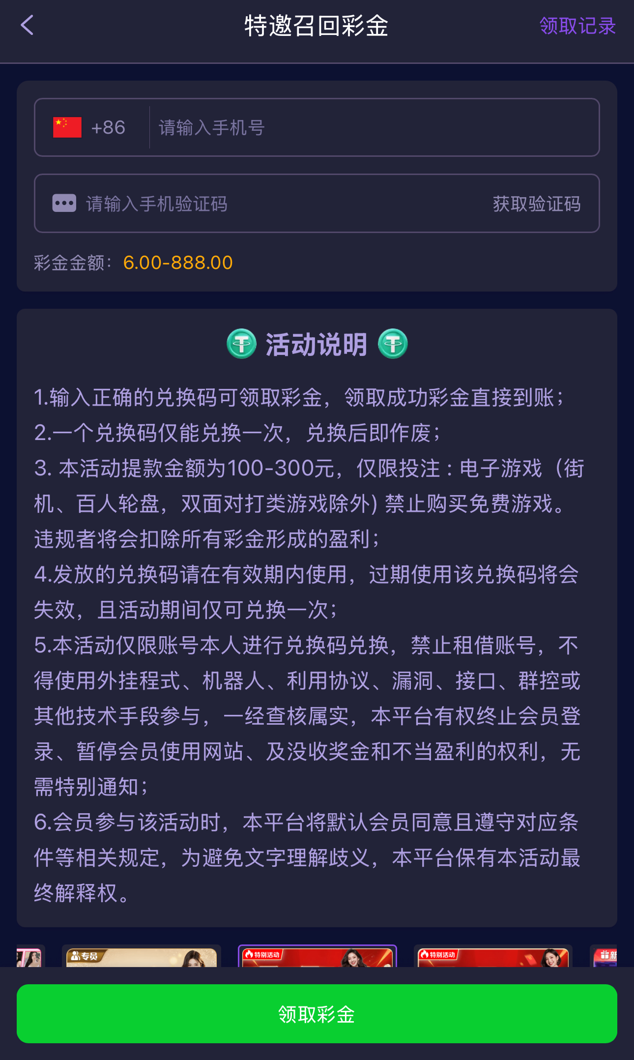 碰瓷特邀召回彩金,老用户有账号的去登录优惠大厅页面自助填写手机号碰瓷召回彩金