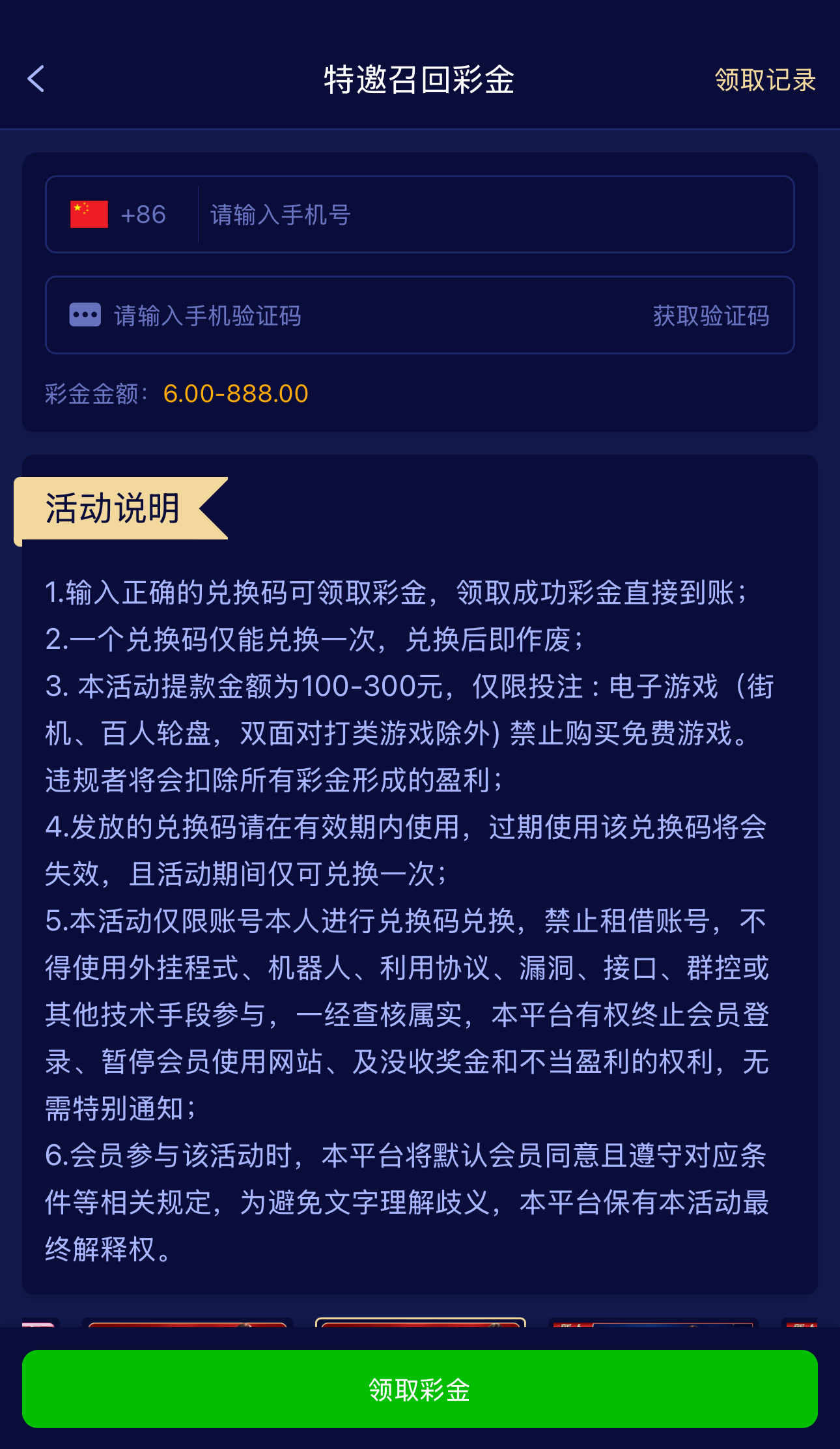 碰瓷特邀召回彩金,老用户有账号的去登录优惠大厅页面自助填写手机号碰瓷召回彩金