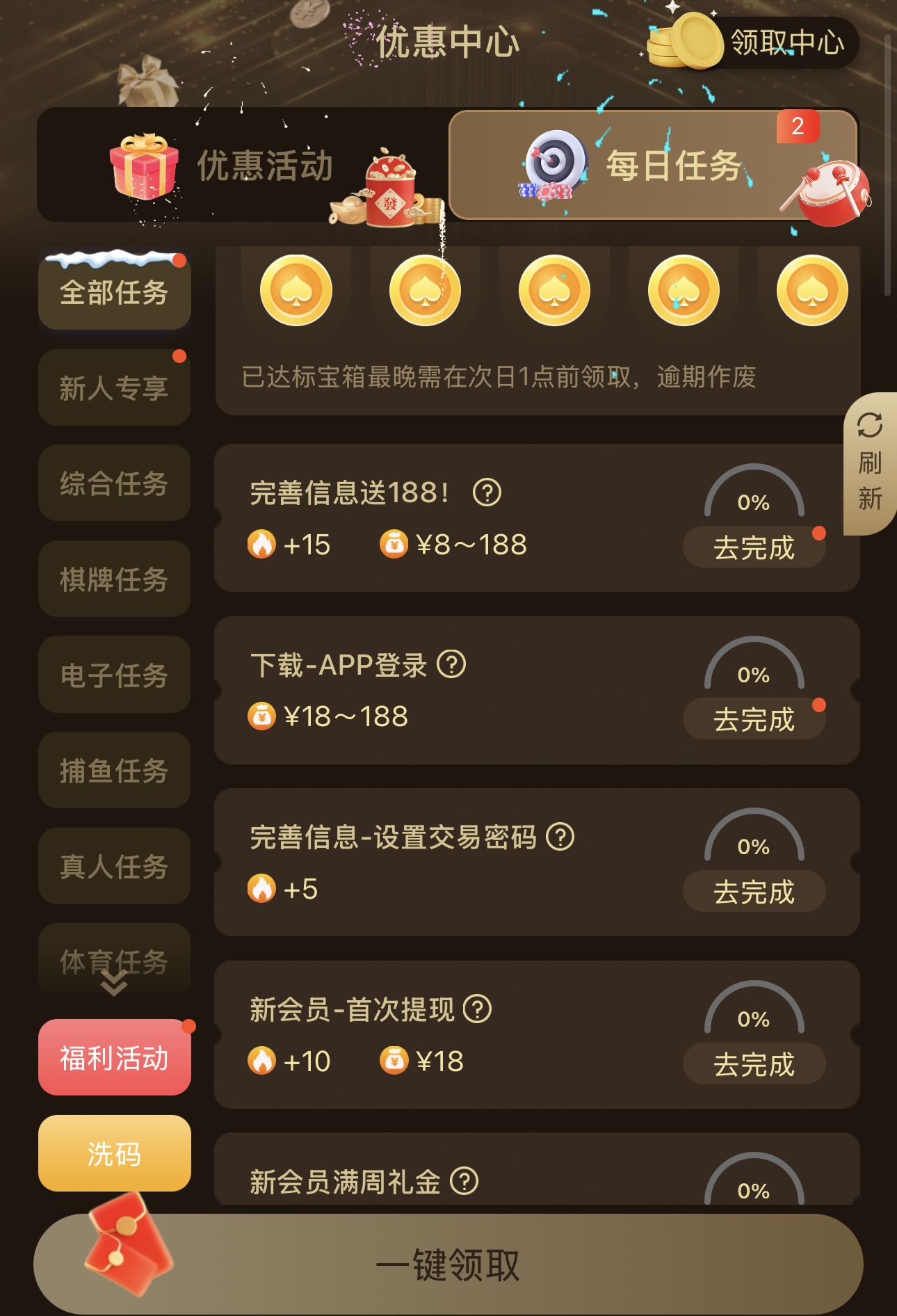 新用户注册绑卡看优惠大厅新人活动里面自助完善资料以后刷新领取